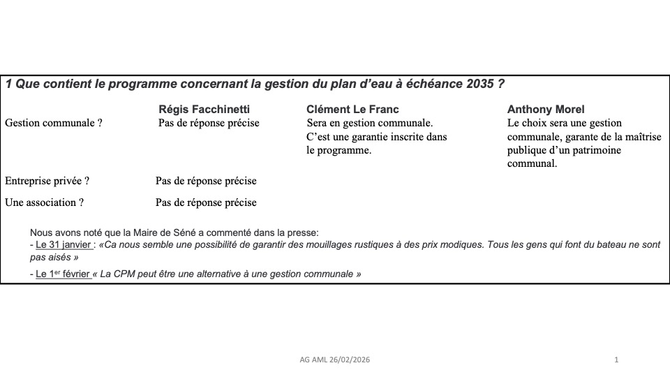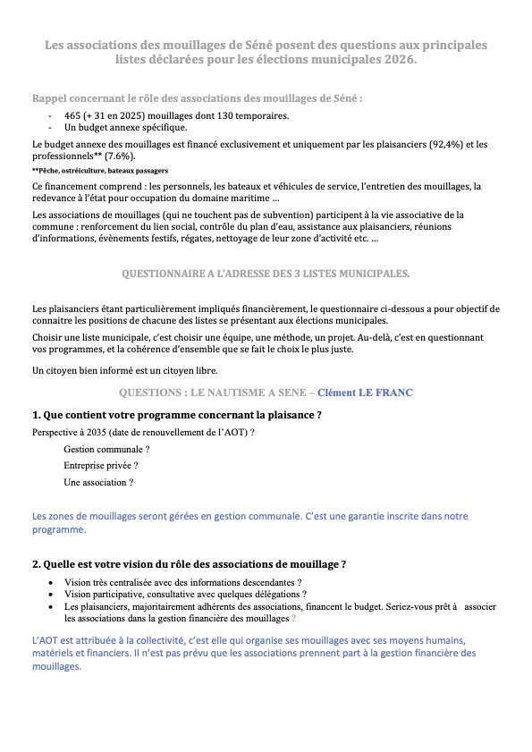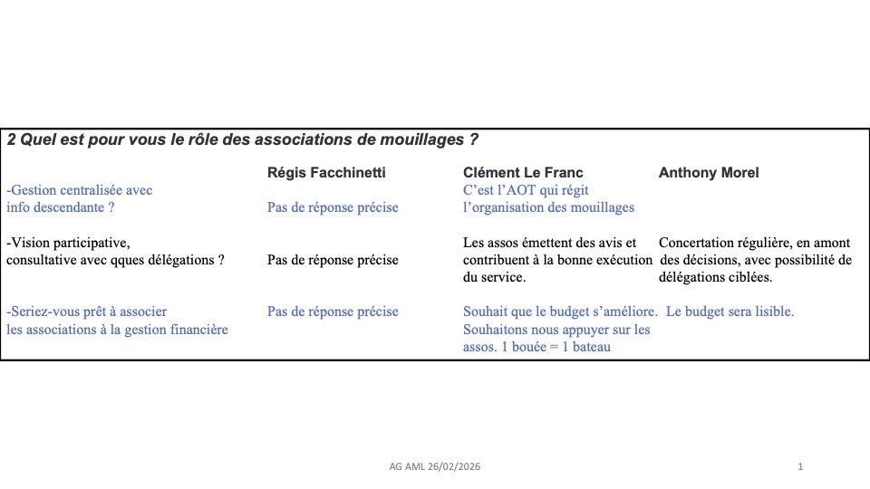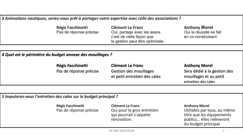 3/11/25 Suite à la réception de leur présentation, nos avons envoyé un courrier à la mairie. En effet, les documents reçus sont différents de ceux présentés 😳. En particulier pour ce qui concerne le budget. De plus, cette année, malgré une météo favorable, des mouillages étaient non occupés. Aussi nous demandons une optimisation des procédures de locations afin d'optimiser les recettes.